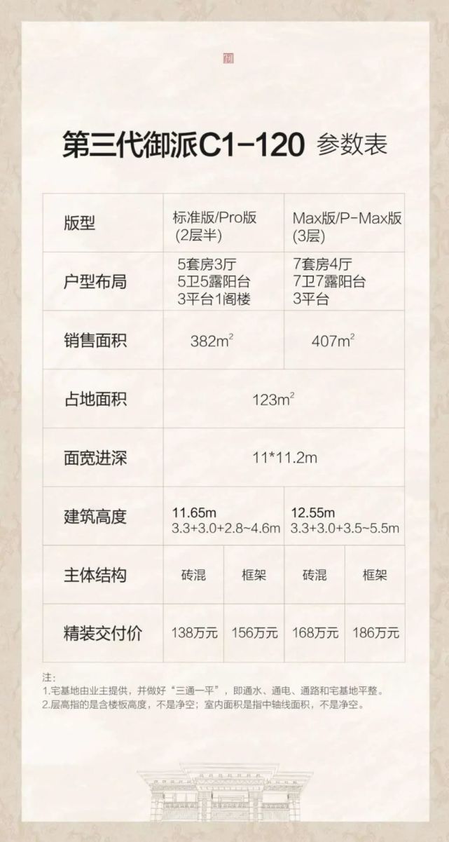 120㎡占地面积,可根据自身需求专属选择:标准版/Pro版=5套房/2.5层;Max版/P-Max版=7套房/3层。4款户型,砖混/框架可选