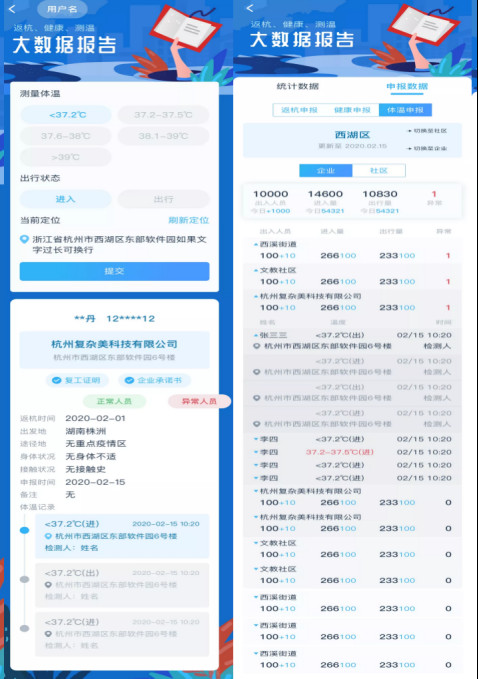 同时,平台对出入社(园)区复工人员的体温测量数据,可进行实时采集和导入,并实现对即将返航、当日返杭、正常、异常及隔离人员的精准分类管控,实大大提升监管部门采集、利用数据的有效性,帮助监管部门实现数据实时分析、动态管理和科学回测。