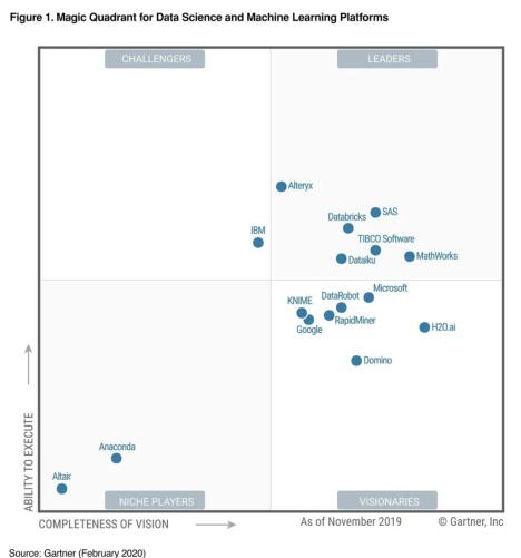 资料来源:Gartner, Magic Quadrant for Data Science and Machine Learning Platforms, Peter Krensky, Pieter den Hamer, Erick Brethenoux, Jim Hare, Carlie Idoine, Alexander Linden, Svetlana Sicular, Farhan Choudhary, 1 February 2020.