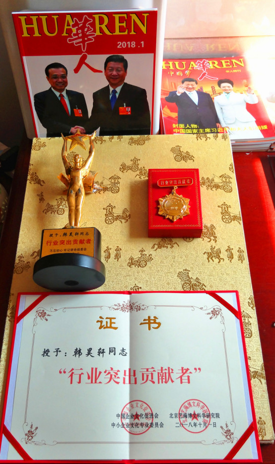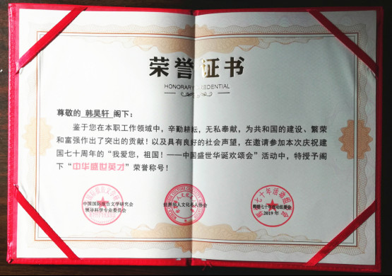 韩昊轩,字:国新, 号鸿运,学厉:本科 祖籍山东滕州,1963年1月出生于黑龙江,主要从事传媒、书画、文化等,社会活动家、荣获2016“海内外杰出爱国人士”、“ 全球公益风采人物”、 2017“中华领航劳动者”、“杰出爱国华人”“世界华人爱心大使”、 “世界华人爱心公益大使” 2018“杰出爱国华人”2018“中华领航劳动者”、“行业突出贡献者”、”2019“和谐中国新时代奋斗者”、 “实干践行者”“中华盛世英才”、“世界华人文化使者”称号等。