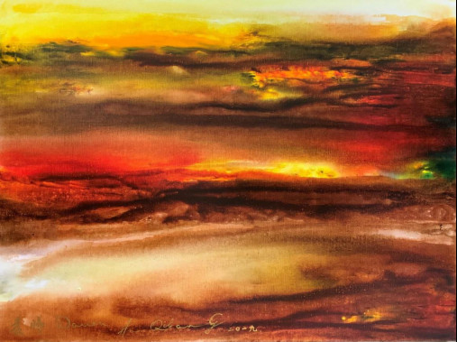 直到二十多年前,在欧洲的一座美术馆,他迷上了以康定斯基为旗手的抽象绘画,他终于找到了能够吐露自己心声的一种表达方式,他终于可以让积压在心底已久的情愫面世。通过《开天辟地》、《地狱之火》、《水的精灵》、《彼岸》、《回家》等系列作品,他开始酣畅淋漓地舒发着他内心深处澎拜的情感,对自然的敬畏,对生活的勇气,对生命的热爱,对信仰的追求。