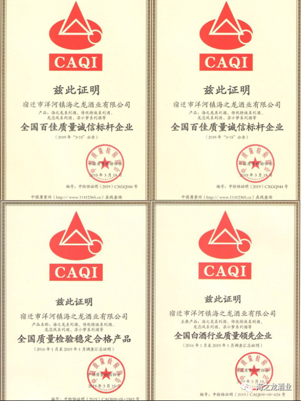 苏小梦系列酒获得中国质量检验协会颁发的“全国质量检验稳定合格产品”等荣誉证书