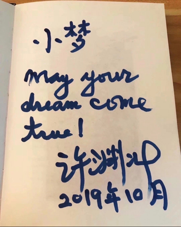 国际译联杰出文学翻译奖诗译英法唯一人、世界著名翻译家许渊冲为苏小梦酒题词《"may your dream come true“》