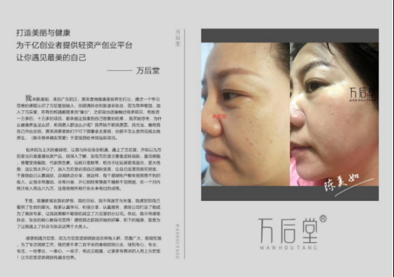 万后堂让您在28天左右年轻5~10岁,解决您面部松弛,细纹,暗黄,粗糙,面色不均等皮肤问题,还能让您在变美的同时,实现收入翻倍。不仅如此,万后堂还会培养您成交的能力、公众演说的能力,以及教您如何打造一支强有力的团队。