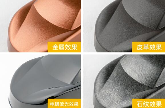 3DVOF通过充分发挥高分子材料膜片的特性,可包覆在工件表面生成不同的装饰表面,如:金属拉丝、电镀、哑光皮革木纹等等,表现色彩远超与喷漆工艺。经过3DVOF包覆的产品可真实模拟各类纹理触感,丰富产品线,同时性能稳定、可塑性强,色彩丰富,能够满足厂家个性化定制的需求。3DVOF利用全自动产线利用,治具覆膜,真空加热,机械裁剪,一次成型,且无任何污染。