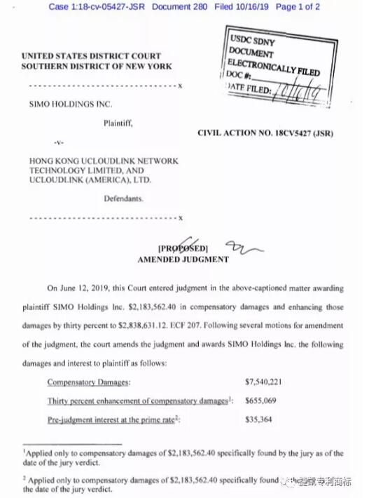 由于法院认定优克联公司的侵权行为是故意为之,因此法院与2019年10月16日再次修改判决,将优克联的赔偿金额由218万美元增加至820万美元(约5800万元人民币)。