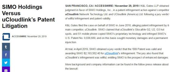 图2:uCloudlink与SIMO (Skyroam美国公司)法院判决书