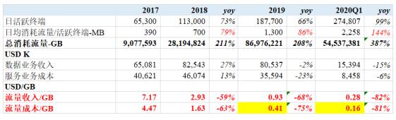 根据公司招股书解释,2020Q1流量收入下降受新冠疫情影响;而2019年较2018年流量收入下降是因为出境游的减少,以及销售渠道由代理商换为电商自营导致销量下降。但是,招股书中披露的公司2017-2020Q1的活跃设备及日消耗流量情况,两项数据2018、2019、2020Q1都出现了大幅增长。优克联解释2018的数据收入较2017有大幅增长,主要原因是活跃设备和日消耗流量的增加。同样的运营数据大幅增长,但是在2018与2019、2020Q1的数据业务收入表现却呈现了相反的结果。