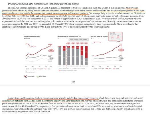 关于云SIM平台这个模式,招股书中更是放了大量的篇幅来描述,同时公司表示未来发展将会继续向轻资产转型,收入组合重点放在毛利水平更高的云平台和流量业务上。