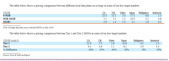 同时,招股书中沙利文也给出了uCloudlink目标市场的流量价格水平,其中印尼流量最便宜,可以做到0.5美元/GB,但是大部分国家和地区都高于1美元/GB。出境游热门的一二线城市流量价格更高,印尼的二线城市流量价格也有1美元/GB,更不要说中国、日本、北美这几个公司收入主要贡献地区。