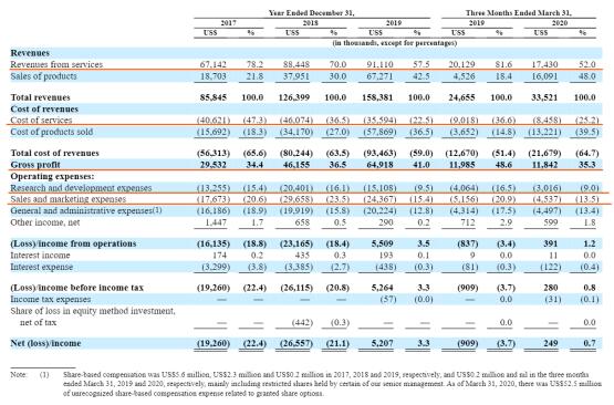 招股书中公司解释,2019及2020Q1两项费用的下降源自对相关人员的裁减和市场投入的减少,一家正在向云SIM平台转型的科技公司,研发团队却不增反减。更让人不解的是,2018年两项费用大幅增长的原因,是公司增加了研发和市场的人员以及品牌市场投入。