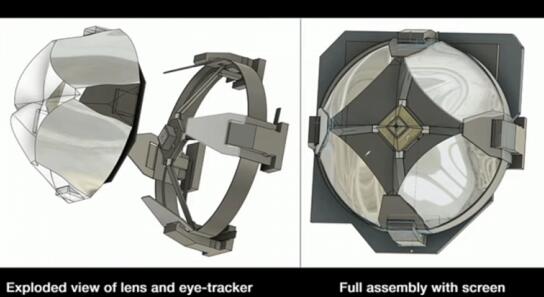 简单解释,非扩瞳的情况就是当你在佩戴VR头显时,清晰的图像往往只是集中在最中心位置视点,如果眼睛位置改变了,画面就会变得十分模糊。可以想象,未来我们所佩戴的VR眼镜如果是基于衍射光波导或者几何光学微透镜阵列,那么我们的眼睛在任何位置注视画面都是相同畸变清晰的图像。