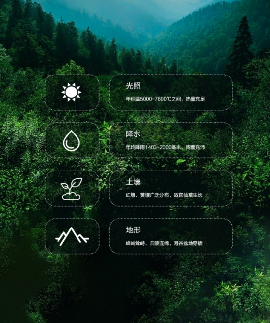 仙人草生长的地方气候条件优越,适宜人类聚居及多种作物生长。有年积温5000-7600℃之间的充足热量,有年均降水1400-2000毫米的充沛雨量;有红壤黄壤遍布,适宜生长的地形;有耸峙的峰峦,连绵的丘陵,还有穿插其间的河谷盆地。只有在这得天独厚的美景沃地,才能生长出符合一早仙草茶要求的仙人草。