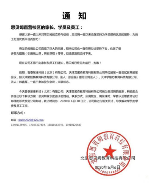 进入6月,不到两个星期时间,北京便有两家机构倒在复课的“黎明”前。一个是主打机器人教育的思贝姆儿童成长中心,无征兆地关闭了4个直营校区,一个是位于丰台区的北外儿童英语(角门校区)。两个无疾而终的线下机构,各自留下200多名无助的家长组织维权、要求退费。