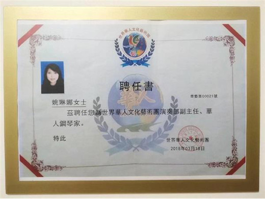 中国文化管理协会音乐艺术专业委员会(CCAA SCM)会员。江苏省徐州音乐家协会会员。获得全国音乐教师资格证。