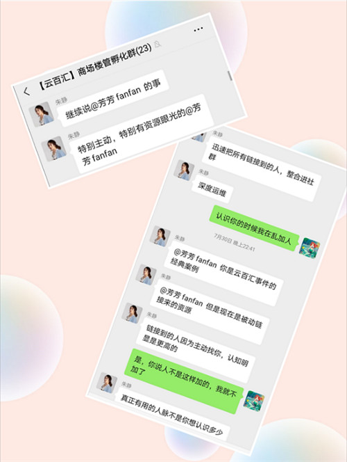 今年疫情期间,芳芳敏锐地捕捉到社群将会是下一个风口,于是她立刻着手学习社群运营。芳芳说,她很幸运,结识了新商业女性南京城市合伙人、云摆摊云商城社群玩法创始人朱静。在她的指引下,一边学习杨瑞老师的《女性社群商业模式第一课》,一边在云商城从小白游客、到店主、主持、管理,现在已经成为了【云百汇】云商城7楼[印象里]的社群运营官,也就是大群主。