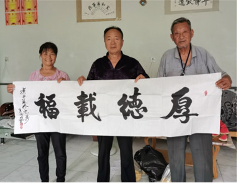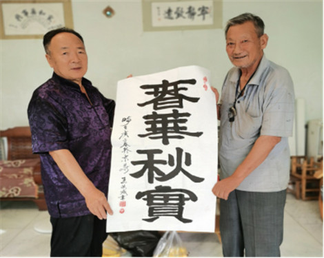 王洪成(左)向申敏捐赠书法作品