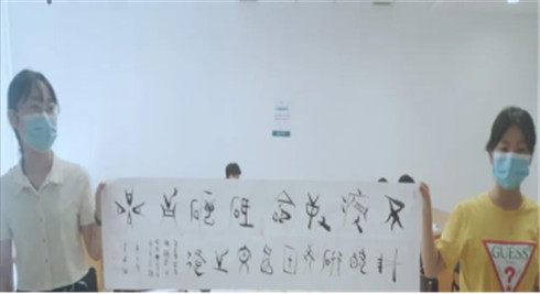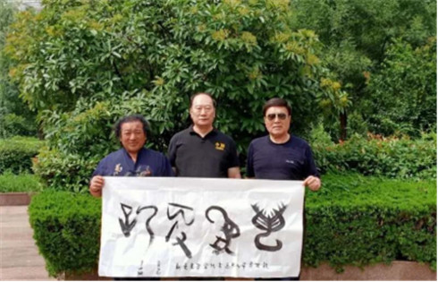 (为世界华人书画家协会主席、香港华人杂志社社长韩昊轩先生(中)用甲骨文书写:万象更新!)