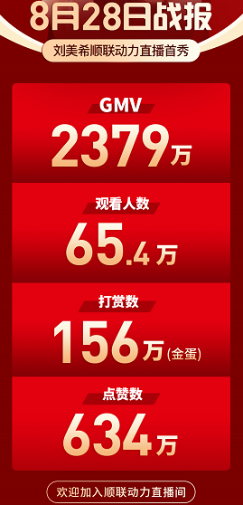 据官方数据统计,刘美希本场直播带货销售额(GMV)累计达2379 万,在线观看人数超过65万,主播获打赏约156万,点赞数达634万。顺联动力直播项目负责人坦言,为了助力刘美希的直播首秀,不少品牌方以赞助的形式来回馈给粉丝,这也是本场直播带货商品优惠幅度巨大的原因之一。借着刘美希的名人带货效应,顺联动力在本次直播带货不仅赚足了眼球,还取得惊人的销售业绩。直播结束后,刘美希当场宣布和顺联动力达成了长期合作关系,自己将常驻顺联动力直播间,并携手顺联动力平台倾力打造直播间“希有好物”系列栏目。