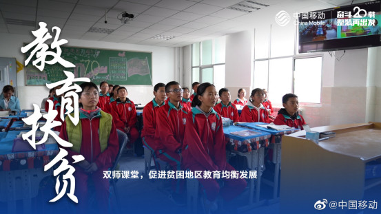 20年以来,中国移动不忘初心,充分发挥自身的网络优势,坚持使用最先进的技术、最优质的网络和最好的服务,为人民群众提供更优质的数字生活。在未来的社会发展中,依托网络基础设施、云计算、大数据、区块链等方面的核心优势,中国移动仍将不断强化教育基础能力建设,全力发展远程教育,推进智能技术赋能教育产业,持续助力我国教育领域从数字化、网络化向智能化加速跃升。同时全面推广“网络+扶贫”模式,全力以赴,为坚决打赢脱贫攻攻坚战、全面建成小康社会贡献更大的力量。
