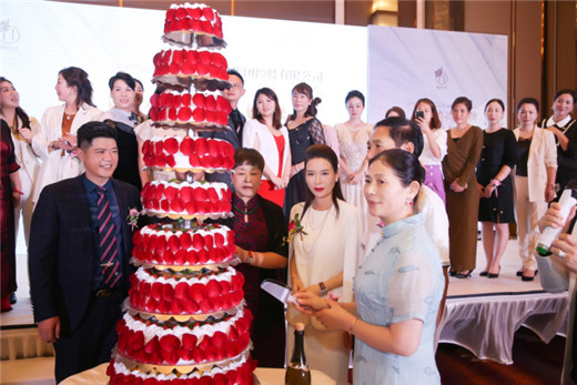 “祝你生日快乐,祝你生日快乐...”随着生日之歌的响起,每个人脸上又增添了一份喜悦的笑容,洋溢起幸福的涟漪,顶端印着赫纳诗LOGO的玫瑰九层蛋糕被推进了会场,我们围成圈,彼此交融,彼此交心,彼此真情流入,许少琴董事长与其父母一同手把手的切下了第一块蛋糕,香槟迸发,玫瑰赠人,手留余香。