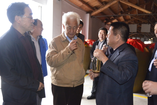 2017年金秋时节,季克良先生莅临古贝春指导工作。在仔细查看了中高温酱香型大曲后说:“在北方能做出这样的曲难能可贵。”在视察了古贝春科研中心后,在科研中心学术报告厅举行了“古贝春集团酱香型白酒专家品评会”。各位专家对三十年古贝元、国蕴·六道和花坛古贝元三款产品进行了仔细品评,给予了高度评价,并给出了“微黄透明,酱香突出,幽雅细腻,酒体醇厚,口感高雅舒适,陈香味浓,回味悠长,空杯留香持久”的评语。会上,季老谈了这次古贝春之行的深切感受。一是没想到古贝春的企业文化特别是各界题词做得如此扎实和丰富多彩,他“来迟了,非常遗憾,如能早一点来,一定能学到更多东西”;二是没想到公司如此尊重科技、尊重知识、尊重人才,从这一点上来说,古贝春的发展后劲还很大;三是没想到公司30多年来对酱香型白酒生产工艺的孜孜不倦地钻研,并取得了很高的成绩,非常难得。