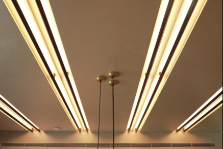 这个餐厅在餐桌位置的光源,这么排布,就是为了大家吃饭的时候低头看盘子的时候不会看到自己的阴影,抬头夹菜的时候菜品可以光鲜亮眼让菜更加秀色可餐,而整个光线也不会有刺眼或者不舒服的地方