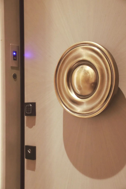 放在侧边,不那么突兀,但同时也能轻松找到。内部开门也为了让女士可以轻松的打开这扇厚重的门,也在侧边设置了一个按钮可以一按就开门