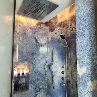 为了保证卫生间淋浴区域的好看但同时不失品位,选择了这种皇家蓝的纹理石材
