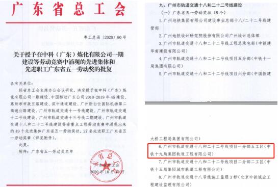 本报广州 讯(通讯员 刘飞)饮冰十年,难凉热血;烽火千里,不忘初心。10月10日,从广东省总工会传来喜报,由中铁十九局集团轨道交通工程有限公司承建,广州市轨道交通十八和二十二号线项目一分部五工区荣获“广东省五一劳动奖状”。这是继10月9日该工区喜获广东省工业工会大湾区建设劳动竞赛“优秀青年突击队”荣誉称号后,又获新荣誉,双喜临门。