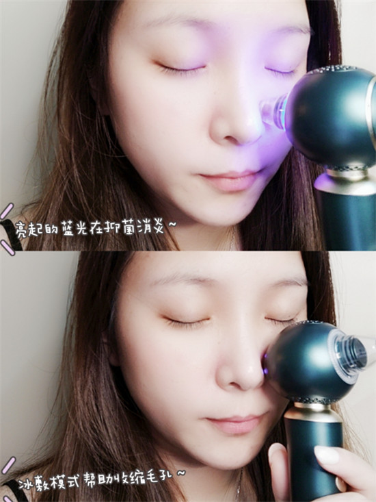 Bosidin蓝光鲸鱼吸去黑头仪采用的方式,与美容院的小气泡原理一样,利用真空负压吸附黑头和螨虫,不会刺激毛孔。在吸黑头的同时,黑头仪会自动打开蓝光,起到抑菌镇静的作用。而与黑头仪配套附赠的冻干粉,可以在使用后,配合冰敷模式达到收缩毛孔的效果。为了更好的去黑头效果,在使之前,先用热毛巾敷一下,帮助我们的脸部毛孔打开,然后涂上湿敷导出液便于黑头导出,再用Bosidin去黑头仪吸出黑头。特别注意的是,使用时不要在同一位置停留太久,在需要祛除黑头部位轻轻移动,慢慢吸出黑头。然后洗干净脸,可以使用冻干粉再配合冰敷模式,帮助毛孔收缩,缓解皮肤压力。