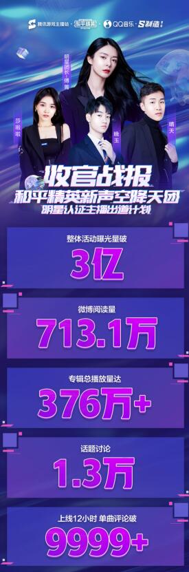 近日,为期两个月的和平精英与QQ音乐以及腾讯游戏认证主播合作的“新声空降团”合作已顺利完成了第一期。本次合作,认证主播+明星(傅菁)打造“新声空降团的成团出道”也获得了各自领域的良好口碑,整体曝光量破3亿的加持下,引发了来自直播平台、和平精英以及QQ音乐的粉丝们热烈讨论,在各大平台就获得了上万条以上的热议评论,效果卓越。