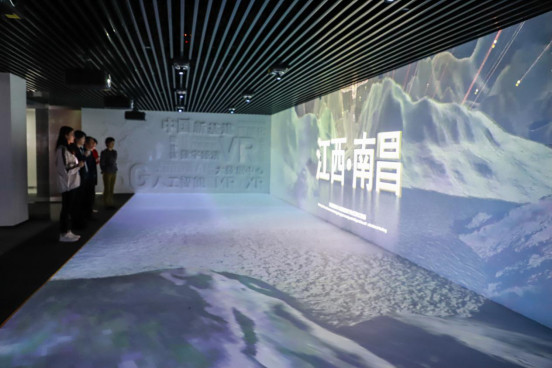 在展区序厅,观看了沉浸式影片“以视界·看世界”,展示红谷滩区以VR为技术核心的新产业加速成势。联合创新中心可以有效整合高通和影创科技的技术领先优势、平台资源,拓宽南昌本地企业的研发及自主创新能力,从而促进VR/AR/MR眼镜及物联网产业的蓬勃发展,是促进江西新兴战略产业发展和传统产业升级转型的重要举措。