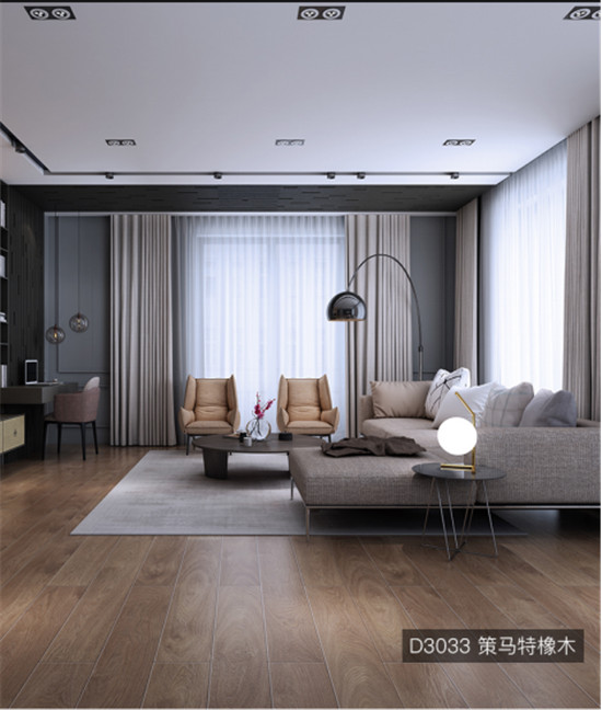 原木色系的地板是地板界的最强CP,它与很多元素或者是颜色都能和谐的搭配出独特的空间效果。比如上图中与灰色调的搭配,散发出浓浓的高级感。首先整体空间的主色调是灰色,但是设计师运用了不同明暗度的灰,让空间从整体上看更有层次感,不会造成视觉上的疲劳。在这样的空间中,地板的选择就显得尤为重要了。既要符合灰色系带来的低调的奢华感又得营造出家的温馨质感。设计师选择的是KRONOSWISS瑞士卢森晶璀系列D3033策马特橡木。这是一款同时拥有天然木材纹理与真实触感的地板,木纹中还若隐若现金色的线条,低调而璀璨。地板自然的颜色加上同步木纹技术的效果,让人拥有一种实木般的感受。