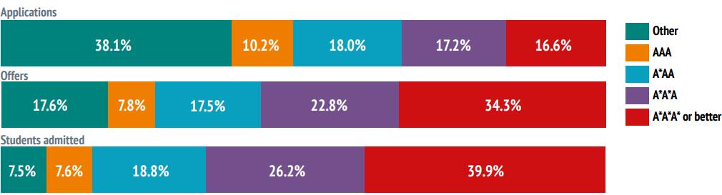 A - Level 成绩AAA是牛津最低录取标准,部分课程要求AAA*。在录取的学生中,满足这一条件的学生占84.9%,而A*A*A*及以上的占比最高。