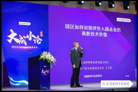 大成高级合伙人、北京市律师协会专利法律专业委员会主任王卫东分享了“园区如何识别、评价入园企业的高新技术价值”,围绕高价值技术的特点、识别评估与与会嘉宾做了充分交流,提出高价值技术的四大基石为“经济价值高”、“技术价值好”、“知识产权权利稳定”及“侵权风险小或可控”,大成专业的知识产权法律服务愿意为企业科技创新和园区高质量发展保驾护航。