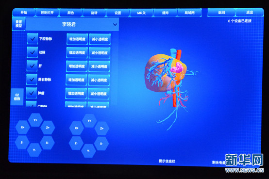 术中手术医师佩戴影创科技 MR 混合现实眼镜,将患者虚拟脏器 1:1 图像呈现出来,清晰准确地了解肝左及周围血管情况。