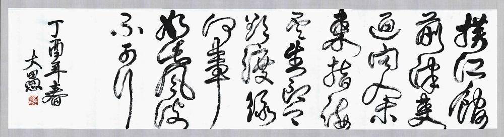 大愚,号虚空,生于1964年,其用笔如作篆籀,洗练凝重,遒劲有力,在行笔谨严处,有纵横奇峭之趣;喜明徐渭之风,追寻黄宾虹“五笔七墨”之技法,创有代表作《新富春山居图》、《黄山汤口》、《秋鸿》、《创世之柱》等名作。