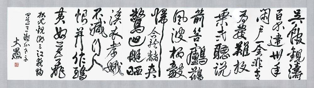 林语堂曾说“一切艺术的问题都是韵律问题”,书法线条也要讲究韵律,用笔节奏要有韵律感,表现出轻重徐疾的丰富变化,书法作品才会有韵味有神采,有不尽的象外之意耐人寻味,东坡曰“以钟王之迹,萧散淡远,妙在笔画之外”。对韵律节奏的把握则有赖于技法的纯熟和修养的提升,只有从两方面不断勤力修悟才能培养出超然的情致,使艺术臻于高格,才能使灵动的韵律,鲜活的感悟不思而至,交会于心,产生任运成象而韵味无穷的书法作品,给人以美感和享受,陶冶和提升。