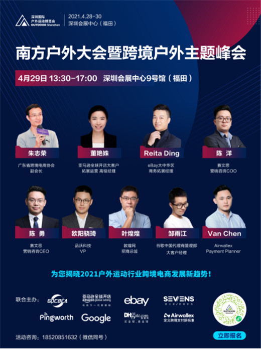 后疫情时代,跨境电商迅猛增长,企业对跨境电商的讨论热度始终居高不下。2021深圳户外展为助力企业拨开跨境电商重重迷雾,获取更多权威信息,将举办户外跨境峰会,并邀请亚马逊、eBay、敦煌网三大跨境电商平台方代表出席会议,分享相关户外产品在各国际市场情况及数据报告,同时也将分享针对户外企业的平台政策。此外,还将邀请跨境圈的服务商如赛文思,airwallex 等企业现场分享,不仅将首次发布户外报告,也将现场解答企业对跨境业务配套服务的有关问题。