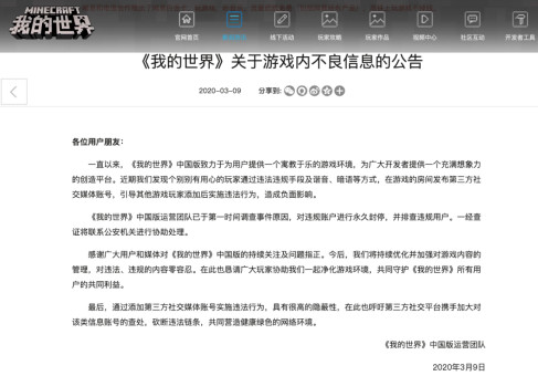 网络游戏事关国家文化建设,事关青少年身心健康,尤其是游戏内涉黄、色情、暴力、引战等乱象,一直都是为人诟病的一大痛点。为此,《我的世界》从2020年开始就每周发布三次公告,严厉打击游戏内外的各种不良违规行为,从而保护青少年群体的身心健康。而这些举措也收到了显著的效果,在《我的世界》游戏中营造出了一个健康清朗的网络环境。