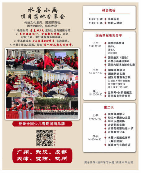 目前水墨小画创始团队正在全国举行国学国画的课程体系落地方案分享会,寻找全国合作校区一起推动国学国画事业的发展,在广州、武汉、成都、深圳、天津、沈阳等城市都设有体验店和校区,欢迎考察交流。