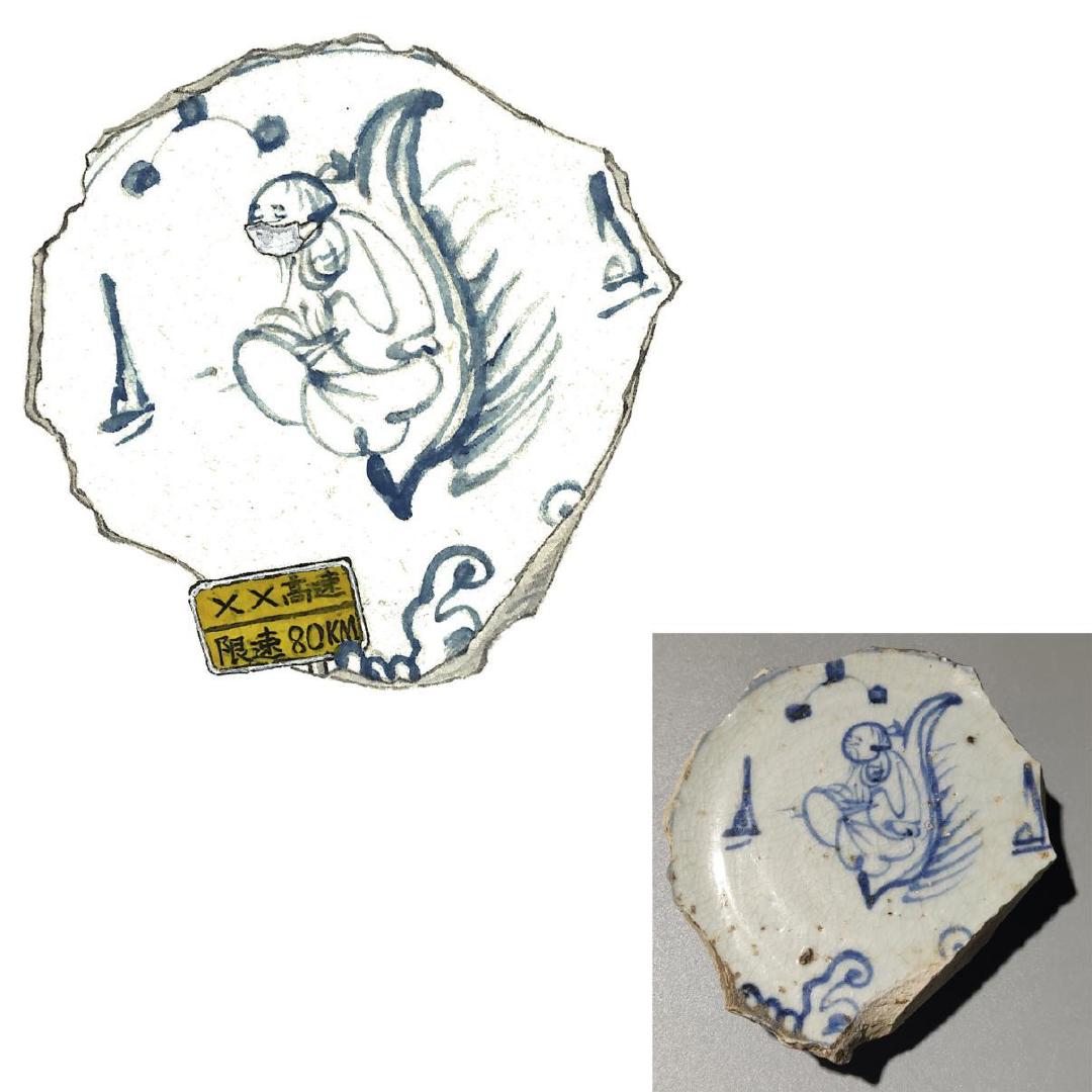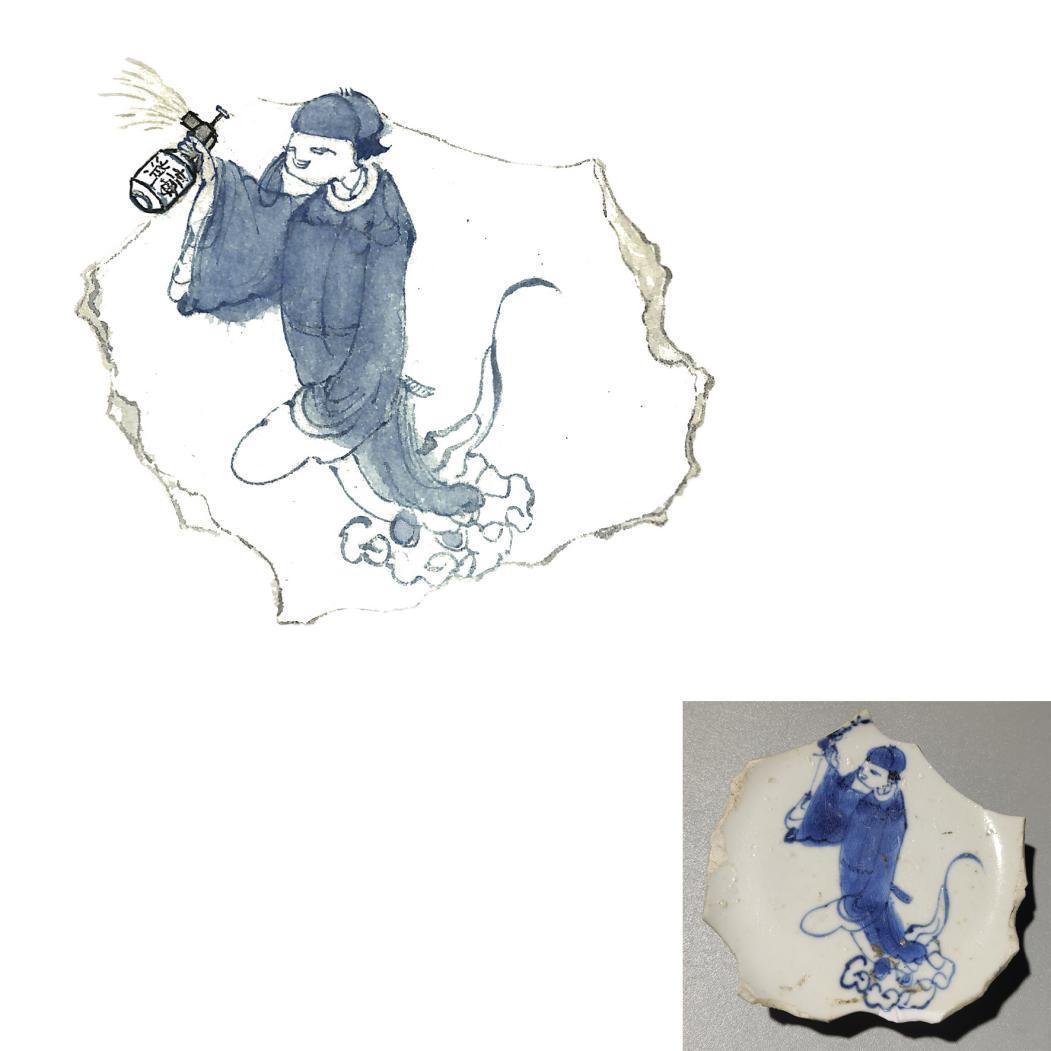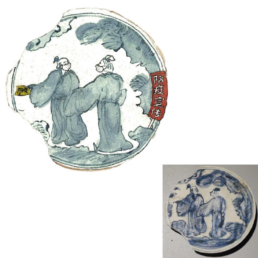 这是一帮“90后”小年轻鼓捣出来的玩意儿,在面对突如其来的新冠疫情时,江西省景德镇市青匆艺集的孟铃烁萌生了一个大胆的想法:从他们收集的1万2千块古瓷片里遴选了5块,画面稍加修改,请出掌故中的“大能”化身“防疫”宣传员。