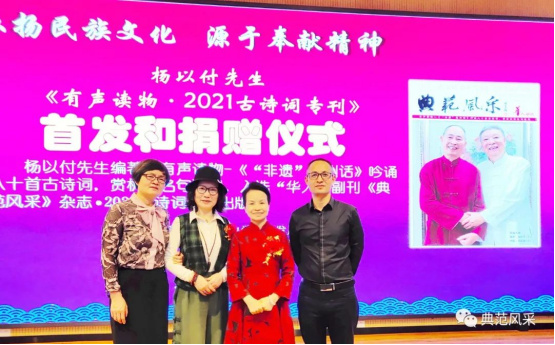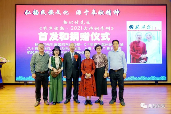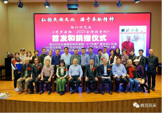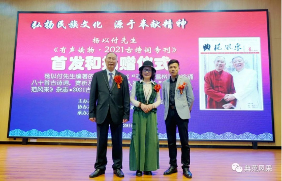 2021年10月28日,杨以付先生编著的有声读物八十首古诗词入选“华人杂志”副刊《典范风采2021古诗词专刊》出版,在温州市仰义中学隆重举行新书首发和杨以付先生公益捐赠仪式。