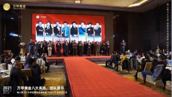 节目毕,万甲黄金八大系统运营总监伴随着慷慨激昂的音乐,他们带领各自的精英上台进行展示,向各位家人展现出了万甲黄金前线市场的强大实力。