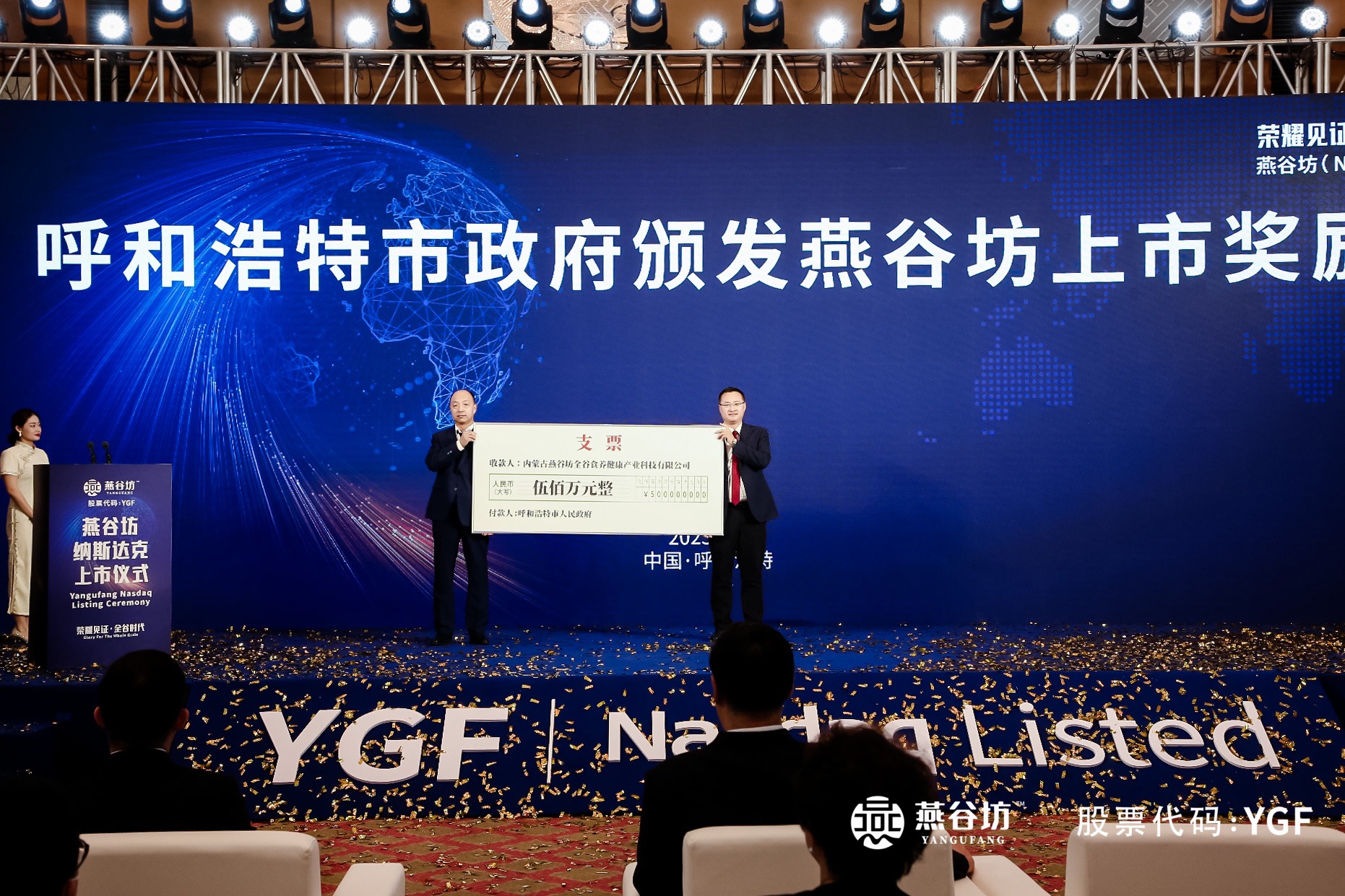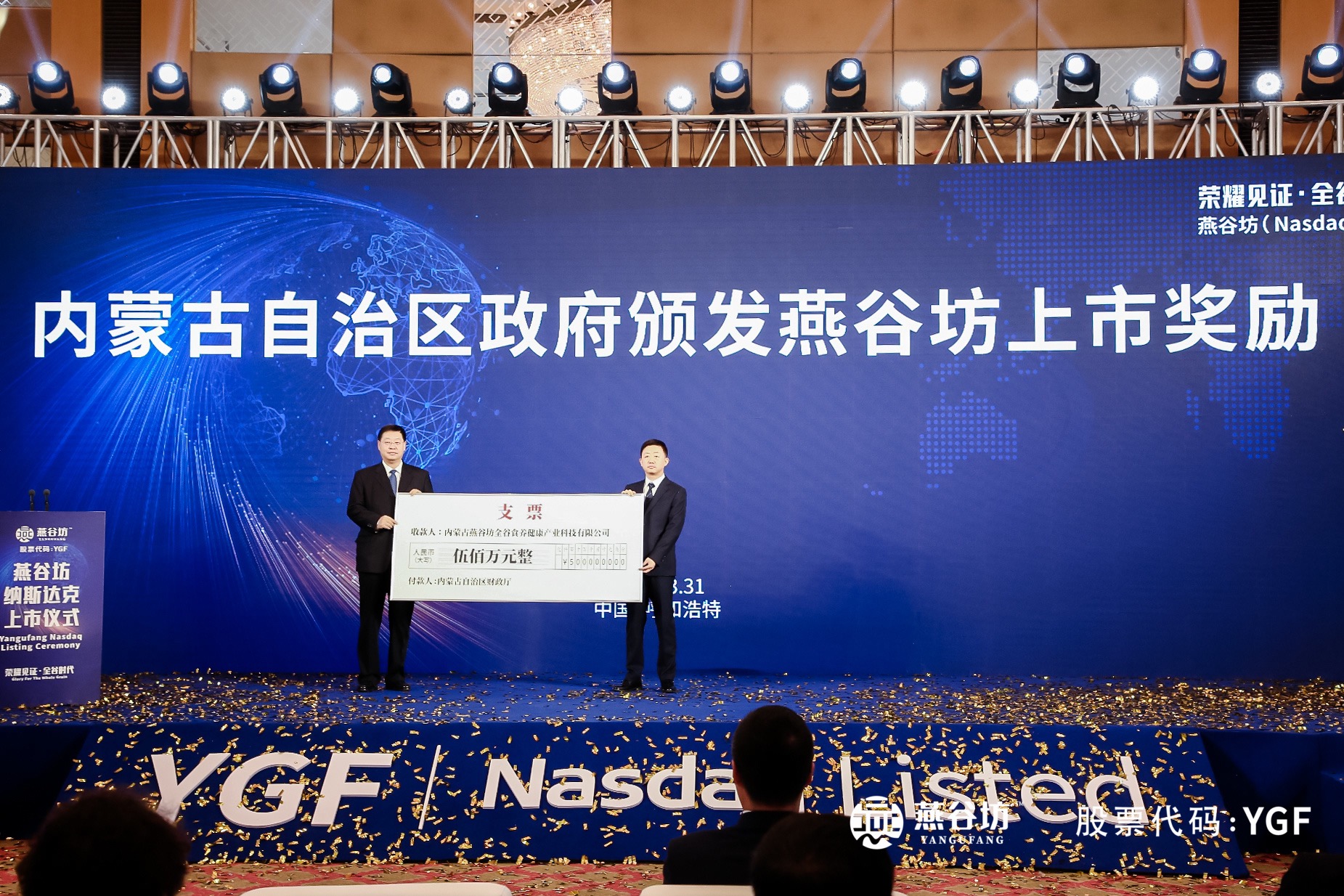 燕谷坊是2023年内蒙古首家在境外上市企业。作为在内蒙古成长起来的企业,燕谷坊的上市开创了全谷物民族品牌发展新纪元。为进一步增强企业上市的积极性和主动性,在内蒙古燕谷坊全谷食养健康产业科技有限公司纳斯达克上市仪式上,燕谷坊获内蒙古自治区政府、呼和浩特市政府奖励总计1000万元。