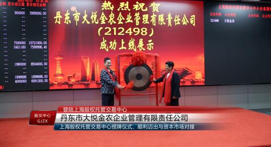 2023年10月27日,随着一阵挂牌锣声响起,经上海朗荣投资管理有限公司推荐, 成功推荐丹东市大悦金农企业管理有限责任公司,企业代码:212498 登陆上海股权交易中心展示板基本信批层,顺利迈出与资本市场对接的第一步。企业领导人前来参加挂牌仪式。
