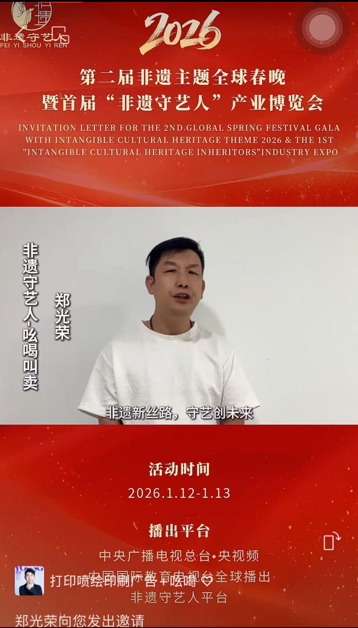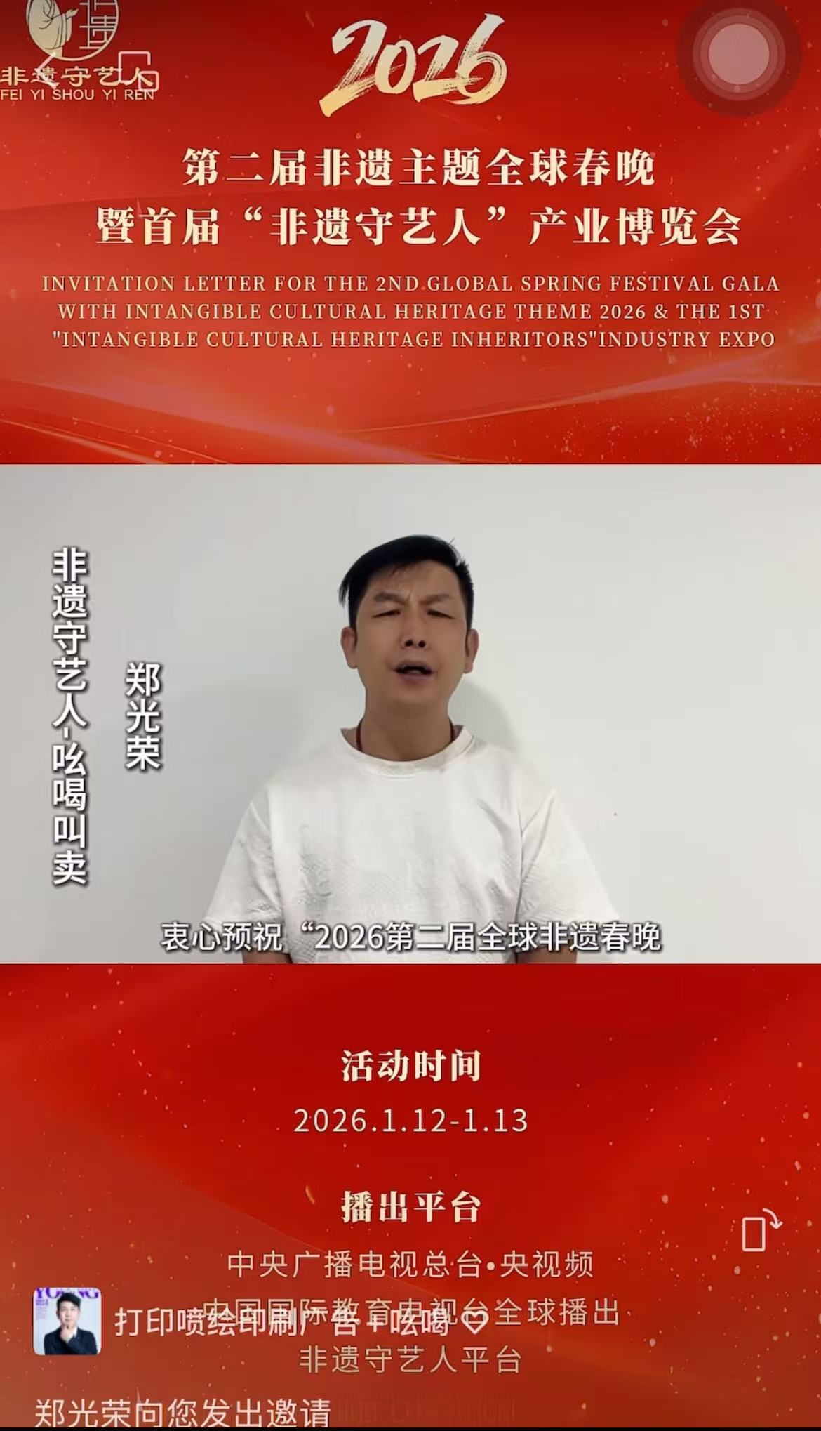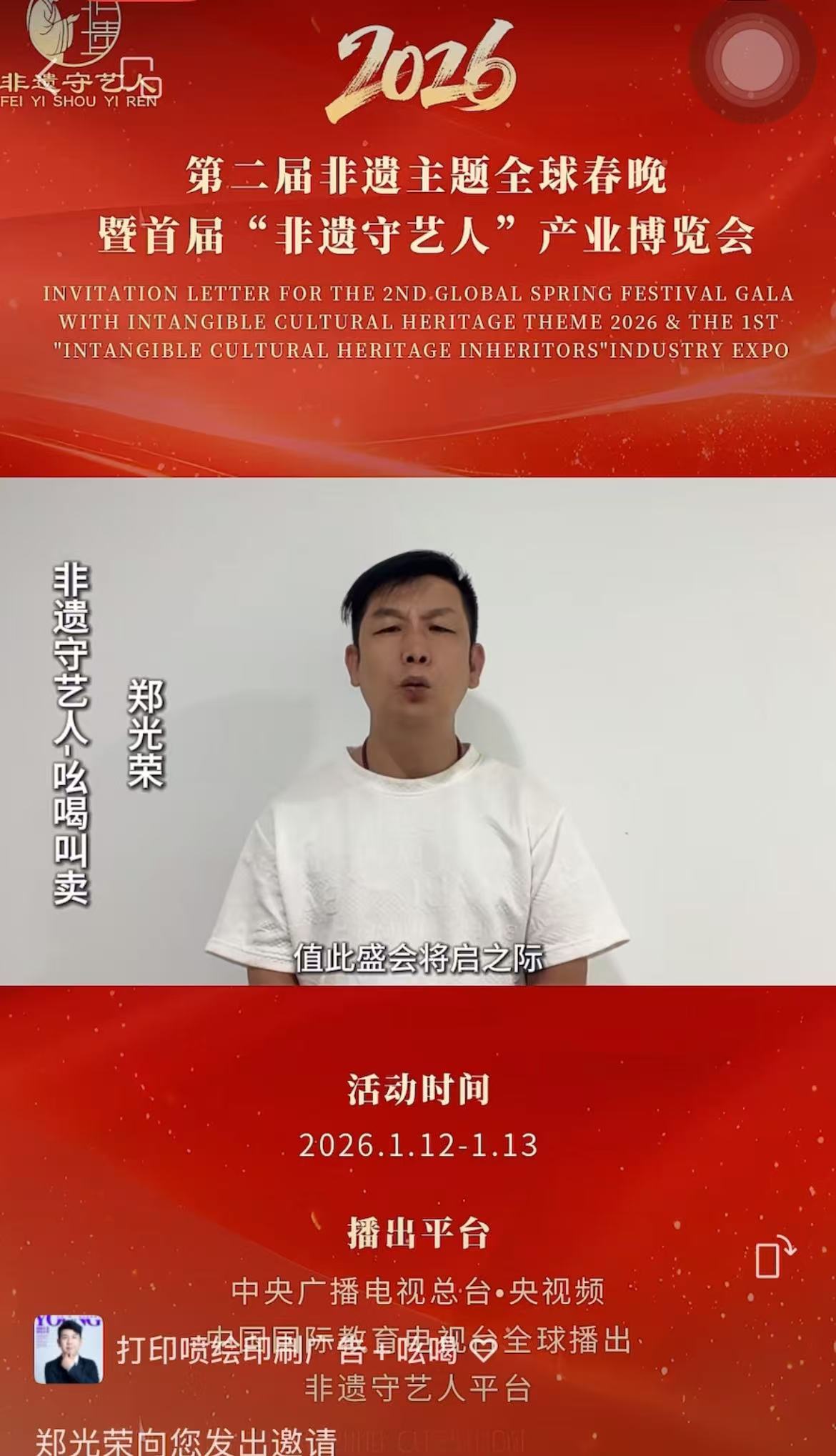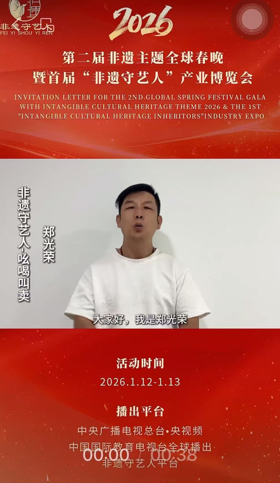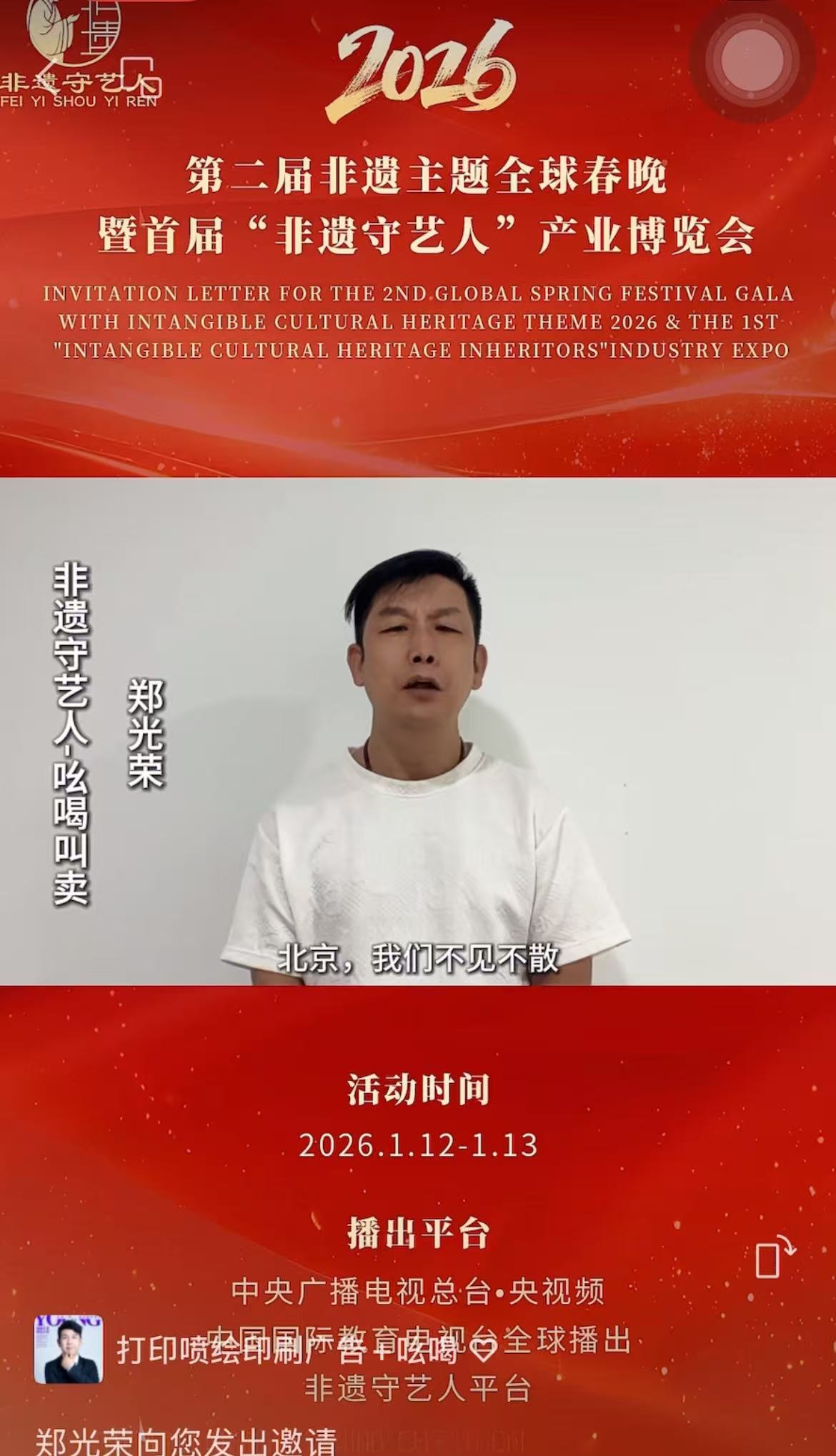 在历史的漫漫长河中,非遗文化宛如熠熠星辰,闪耀着人类文明的独特光辉。2026第二届非遗主题全球春晚暨首届“非遗守艺人”产业博览会盛大启幕在即,来自北京正明圣达叫卖团的郑光荣,将以非遗吆喝为桥梁,热忱邀请全球友人共赴这场意义非凡的文化盛会。