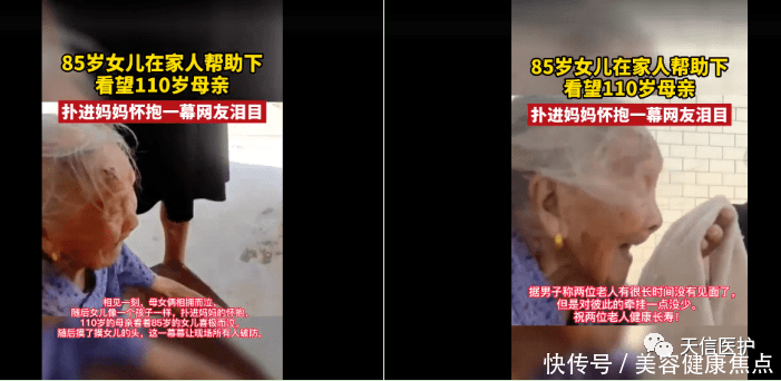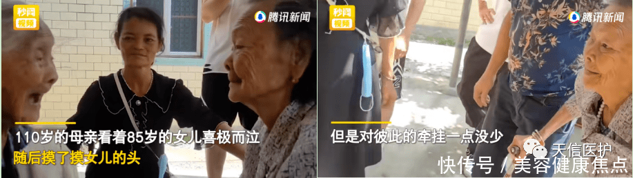 母女俩相见一刻,相拥而泣,随后女儿像一个孩子一样,扑进妈妈的怀抱,就像小时候一样,贪恋着妈妈的温暖和爱抚。110岁的母亲看着85岁的女儿喜极而泣,用颤抖的双手细心地摸了摸女儿的头,这一幕,让现场所有人都破防,也让无数网友为之落泪。