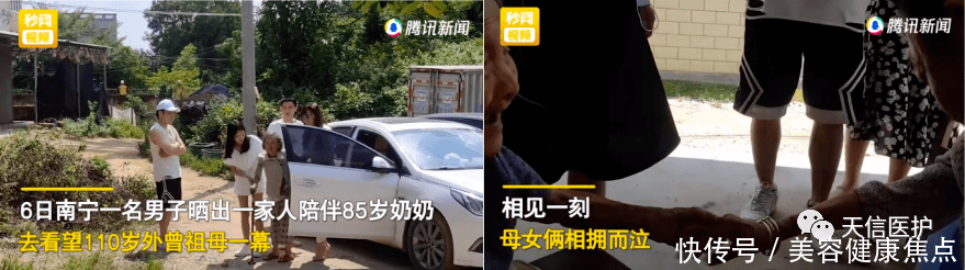 坐标广西南宁,一名男子晒出一家人陪伴85岁奶奶,去看望110岁外曾祖母。当天阳光明媚,秋风和煦,一辆白色的小汽车,徐徐驶入一处农家小院,从车上,下来一位白发苍苍的老人,她拄着拐杖,由两名家人搀扶,步履蹒跚。